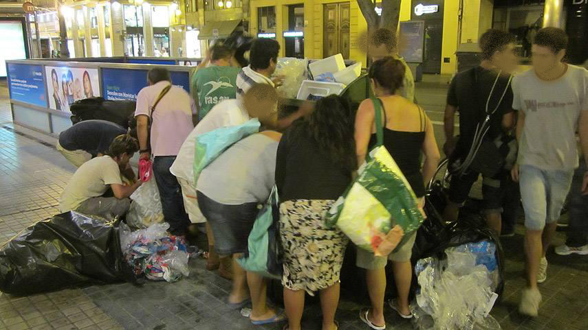Me gusta salir a pasear cuando cae la tarde. En verano porque durante el día suele hacer mucho calor y en invierno porque es cuando estoy libre de otros menesteres. Cojo las llaves de casa y me doy una vuelta por el barrio. En la zona de Madrid donde yo vivo se juntan un barrio super pijo y caro con otro más de medio pelo y, en las calles pequeñas, más escondidas y humildes, viven bastantes emigrantes preferentemente de Latinoamérica. Cuando empezó la inmigración, me encontraba con que bastantes de estos hispanos del otro lado del charco esperaban los cierres de los supermercados y tiendas de alimentación para hurgar en las basuras y llevarse a su casa alimentos todavía en bastante buen estado que estaban a punto de caducar o que acaban de pasar la fecha y no eran , por lo tanto, susceptibles de reciclar o donar a bancos de alimentos. «¡Vaya mierda! -pensaba yo- venir desde tan lejos, para tener que andar así, buscando comida en los contenedores». Hace tiempo que el panorama de los buscadores cambió. Creció porque a los habituales se añadieron personas del barrio de toda la vida, ancianos a los que veo y saludo, con los que me paro a hablar un ratito… cuando es de día. Porque a esas horas en que la luz cae o se ha ido, miran para otro lado, intentan zafarse de mi saludo, no están, no existen para mí. Les da vergüenza que los vea alrededor de la basura. Y yo paso mirando también para otro lado o me cambio de acera porque me dan pena. Todos. Mis conocidos y los que no lo son. A muchos ancianos de mi barrio, que hasta hace poco vivían tranquilos con su pensión, la carestía de la vida les ha llevado a la miseria y no llegan a fin de mes. Ni a mediados probablemente.